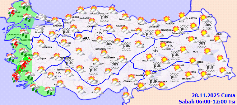 MGM tarafından yayımlanan 28 Kasım Cuma gününe ait meteorolojik görünüm raporuna göre, Türkiye genelinde hava parçalı ve yer yer çok bulutlu olacak. Özellikle Marmara'nın batısı ve Kıyı Ege ile Bursa ve Manisa çevreleri aralıklı sağanak ve gök gürültülü sağanak yağışın etkisi altına girecek.