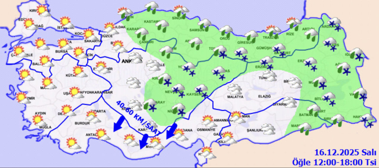 Meteoroloji Genel Müdürlüğü’nün son değerlendirmelerine göre, Türkiye genelinde hava durumu bölgelere göre farklılık gösterecek. Ülkenin kuzey, iç ve doğu kesimleri parçalı ve çok bulutlu bir gökyüzünün etkisi altında olacak. Orta ve Doğu Karadeniz kıyıları, Bartın, Sinop, Karabük, Batman, Mardin ve Siirt çevrelerinde yağmur ve sağanak, İç Anadolu’nun doğusu, Orta ve Doğu Karadeniz’in iç kesimleri, Doğu Anadolu’nun kuzey ve doğusu ile Kastamonu, Çankırı ve Diyarbakır çevrelerinde ise karla karışık yağmur ve kar yağışı bekleniyor. Diğer bölgelerde havanın az bulutlu ve açık geçeceği tahmin ediliyor.