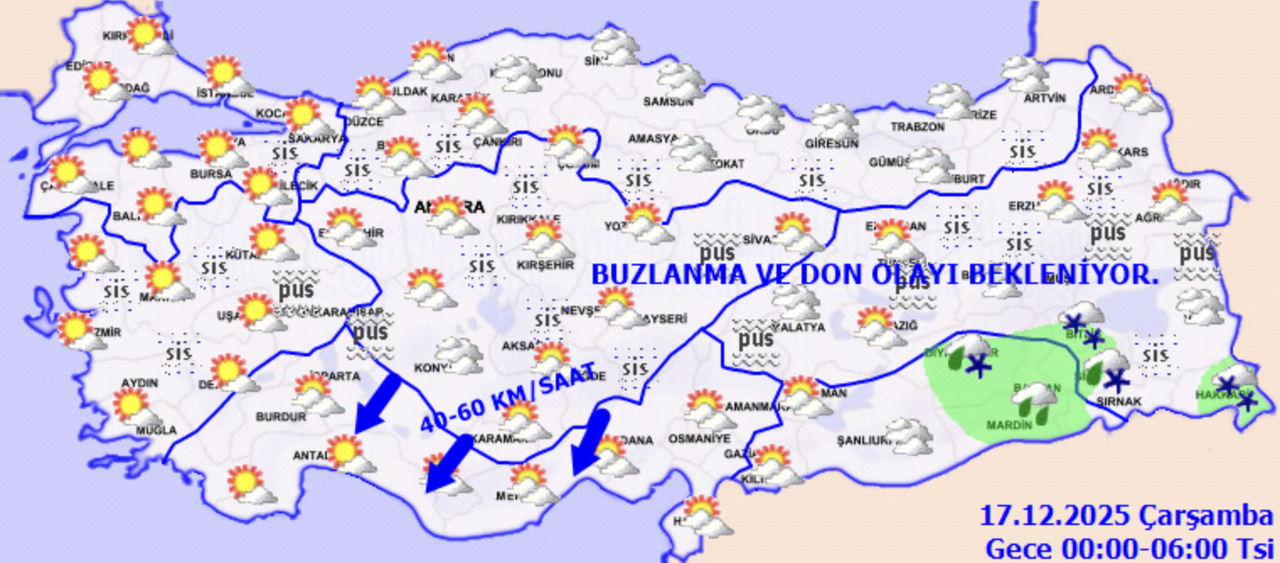Parçalı ve çok bulutlu, bölgenin kuzey ve doğusunun aralıklı karla karışık yağmurlu ve kar yağışlı geçeceği tahmin ediliyor. Sabah ve gece saatlerinde buzlanma ve don ile birlikte pus ve yer yer sis bekleniyor.