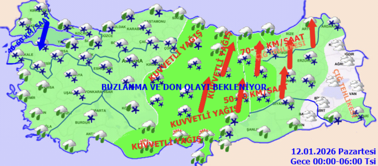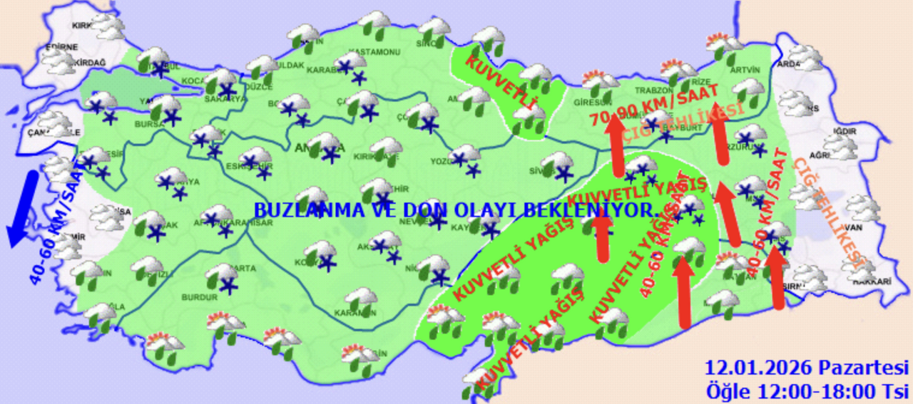 Yağışların bazı bölgelerde hayatı olumsuz etkileyecek kadar şiddetli olması bekleniyor. Orta ve Doğu Akdeniz, İç Anadolu'nun güney ve doğusu, Batı Karadeniz (Karabük hariç), Orta Karadeniz ile Doğu ve Güneydoğu Anadolu’nun batısında yer yer kuvvetli yağışlar görülecek. Ayrıca Sakarya, Giresun, Trabzon, Gümüşhane, Bayburt, Bingöl ve Diyarbakır çevresinde yaşayan vatandaşların sel, su baskını, yıldırım ve buzlanmaya karşı son derece tedbirli olması gerekiyor.