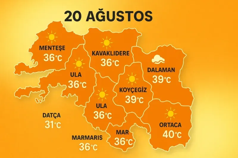 Muğla’da 20 Ağustos Salı günü sıcaklıklar mevsim normallerinin üzerinde seyredecek. Bazı ilçelerde 40°C’ye yaklaşan değerler beklenirken, nem oranlarının yüksekliği vatandaşları bunaltacak. İşte ilçe ilçe hava tahminleri…