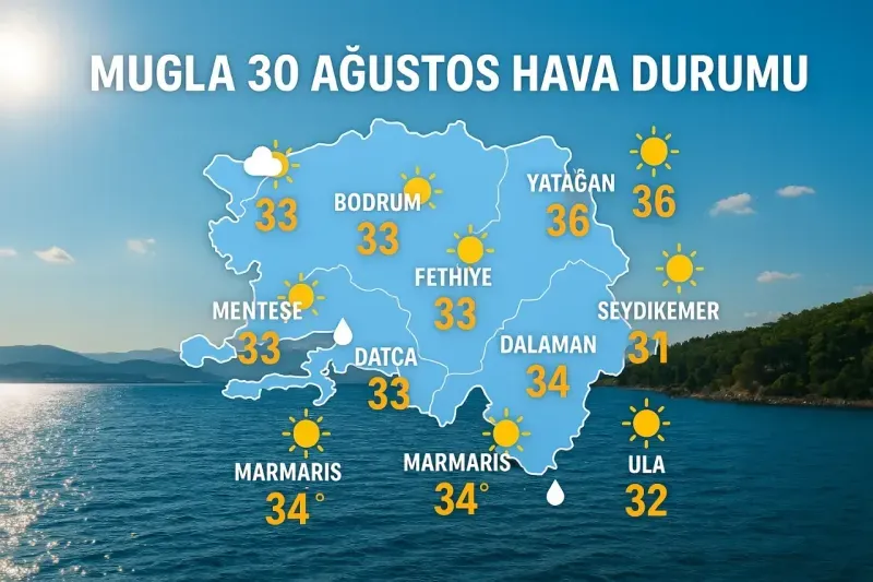 Muğla’da 30 Ağustos’ta hava sıcaklıkları 31 ila 36 derece arasında değişecek. İlçelerin çoğunda açık hava hakim olurken, özellikle Marmaris ve Bodrum’da nem oranı yüzde 95’in üzerine çıkacak.