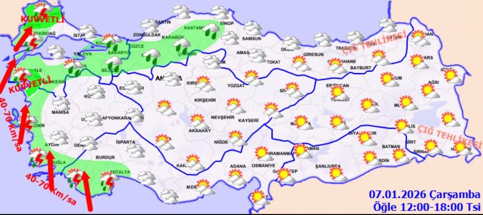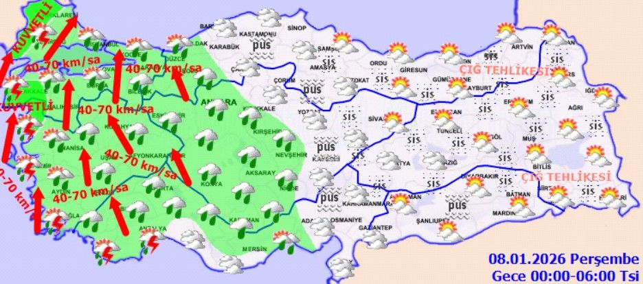 Ülkenin batısı yağmurla boğuşurken, iç ve doğu kesimlerde dondurucu hava etkisini sürdürüyor. Doğu Anadolu’nun doğusu ile Doğu Karadeniz’in iç kesimlerinde yüksek kar örtüsü bulunan eğimli yamaçlarda çığ tehlikesi bulunuyor. Ayrıca iç ve doğu bölgelerde gece ve sabah saatlerinde buzlanma, don, pus ve yer yer sis hadisesi görülecek. Hava sıcaklıklarının Güneydoğu Anadolu'da mevsim normalleri altında, diğer yerlerde ise normallerin üzerinde seyredeceği tahmin ediliyor.
