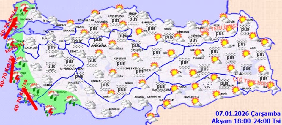 Hava Durumu: Parçalı ve çok bulutlu, sağanak ve yer yer gök gürültülü sağanak yağışlı, Rüzgar: Güney ve güneydoğudan, Kuzey Ege’nin kuzeyi güneybatıdan 6 ila 8, yer yer 9 kuvvetinde, Dalga: 3,0 ila 4,0 m, yer yer 4,5 m, Görüş: İyi.