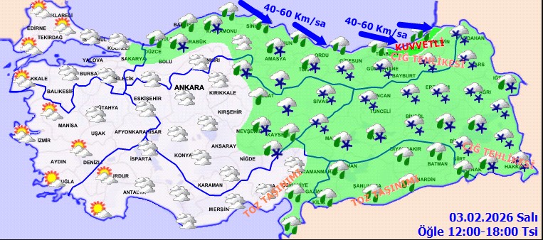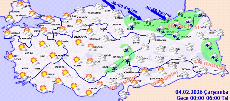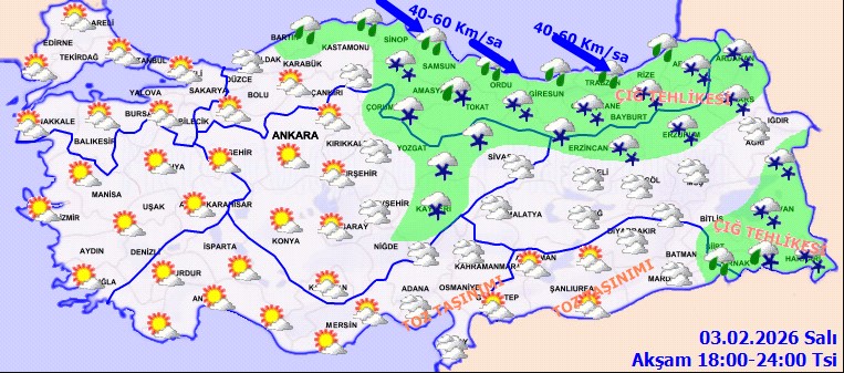 Çok bulutlu, Doğu kıyılarında yerel kuvvetli olmak üzere, bölge genelinin aralıklı yağışlı geçeceği tahmin ediliyor. Yağışların, genellikle yağmur ve sağanak, Doğu Karadeniz'in iç kesimlerde karla karışık yağmur ve kar şeklinde olması bekleniyor. Rüzgarın, Orta ve Doğu Karadeniz kıyılarında kuzey ve batılı yönlerden kuvvetli (40-60 km/sa) eseceği tahmin ediliyor. Doğu Karadeniz'in iç kesimlerde buzlanma ve don olayı bekleniyor. Doğu Karadeniz'in iç kesimlerinde yüksek kar örtüsüne sahip eğimli alanlarda çığ tehlikesi bulunmaktadır.