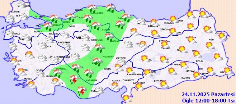 MGM tarafından yayımlanan 28 Kasım Cuma gününe ait meteorolojik görünüm raporuna göre, Türkiye genelinde hava parçalı ve yer yer çok bulutlu olacak. Özellikle Marmara'nın batısı ve Kıyı Ege ile Bursa ve Manisa çevreleri aralıklı sağanak ve gök gürültülü sağanak yağışın etkisi altına girecek.