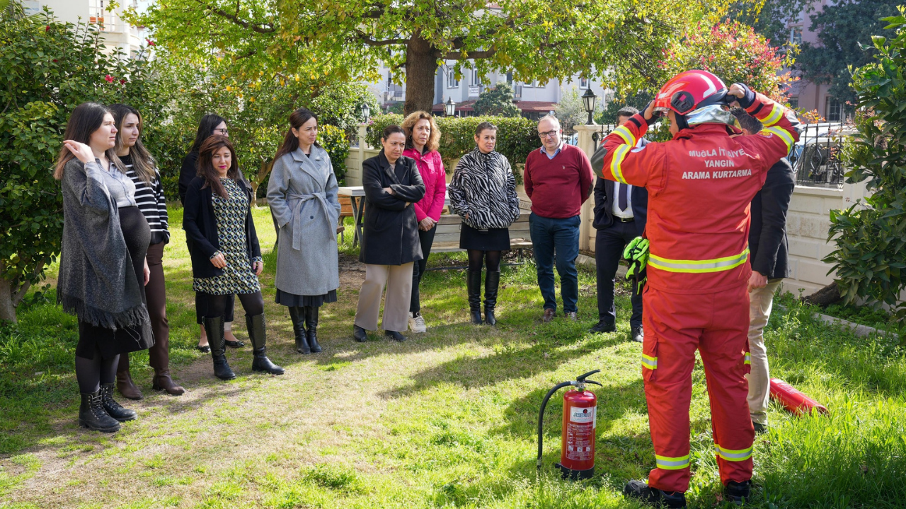 FTSO’da 25 Şubat 2026 tarihinde gerçekleştirilen eğitim, Muğla Büyükşehir Belediyesi İtfaiye Daire Başkanlığı Fethiye Grup Amirliği ekipleri tarafından verildi. Eğitimin ilk bölümünde katılımcılara binalarda alınması gereken yangın önlemleri, yangın anında izlenecek doğru davranış biçimleri, yangın türleri ve müdahale yöntemleri hakkında kapsamlı teorik bilgiler aktarıldı. Uzman ekipler, yangın risklerinin azaltılması ve acil durumlarda panik yapılmadan hareket edilmesinin önemine dikkat çekti.