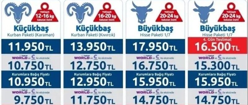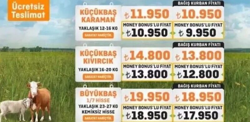 CarrefourSA, kaliteli kurbanlık arayanlar için çeşitli seçenekler sunuyor ancak fiyatlar biraz daha yüksek. 1/7 hisse, 20-23 kg aralığındaki büyükbaş kurbanlık 16.500 TL'den satılıyor. Küçükbaş arayanlar için ise Kıvırcık koyunu (12-15 kg) 13.950 TL'ye, Karaman koyunu (20-23 kg) ise 11.950 TL'ye alıcı buluyor.