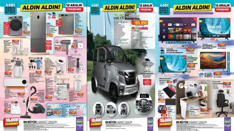 Kataloğun elektronik bölümünde dikkat çeken fırsatlar arasında Toshiba 65’’ 4K Ultra HD Android TV, Philips 40’’ Full HD Led TV ve Hi-Level 32’’ WebOS HD Ready TV gibi büyük ekranlı televizyon modelleri uygun fiyatlarla satışa sunuluyor. Evinizdeki eğlence deneyimini zirveye taşıyacak bu modellerin yanı sıra, Philips ve Hi-Level markalarının smart TV seçenekleri de cazip fiyatlarla mağazalarda olacak. Ev eşyaları ve beyaz eşya kategorisindeki fırsatlar da kaçırılmayacak cinsten. Raflı çalışma masası, English Home Multi Blender seti, Pierre Cardin saç kurutma makinesi gibi pratik ürünler, her bütçeye hitap edecek fiyatlarla A101’de sizi bekliyor. Küçük ev aletleri ve mutfak gereçlerinde ise büyük indirimler dikkat çekiyor. Çay makinesinden tüy alma cihazına kadar geniş bir yelpazeye sahip ürünleri avantajlı fiyatlarla edinebilirsiniz.