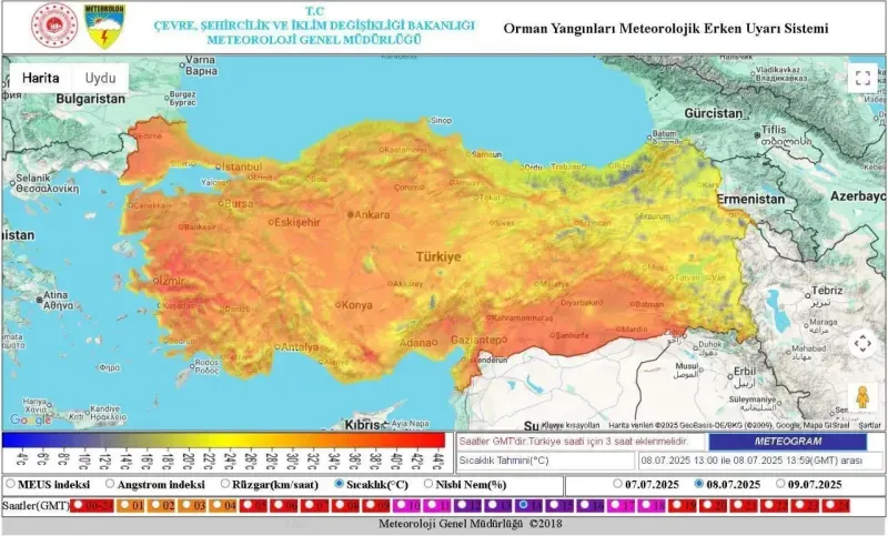 Meteoroloji Genel Müdürlüğü’nün son MEUS tahmin haritasına göre, 09 Temmuz’dan itibaren Türkiye’nin büyük bir bölümü aşırı sıcak hava dalgasının etkisi altına giriyor. Ege, Akdeniz, İç Anadolu ve Güneydoğu Anadolu’da sıcaklıkların yer yer 44 dereceyi bulması, nem oranlarının ise %20’nin altına inmesi bekleniyor. Uzmanlar, bu koşulların orman yangınları açısından büyük risk oluşturduğunu belirterek vatandaşları uyardı.