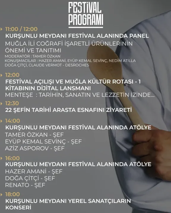 Etkinlik, saat 11.00’de “Muğla İli Coğrafi İşaretli Ürünlerinin Önemi ve Tanıtımı” paneli ile başlayacak. Ardından festivalin resmi açılışı yapılacak ve “Muğla Kültür Rotası 1” kitabının dijital lansmanı gerçekleştirilecek. Saat 12.30’da 22 ünlü şef, tarihi Arasta esnafını ziyaret ederek gastronomi kültürünü bölgeyle bütünleştirecek. 14.00 ile 18.00 saatleri arasında ise ulusal ve uluslararası şeflerin katılımıyla atölye çalışmaları düzenlenecek.