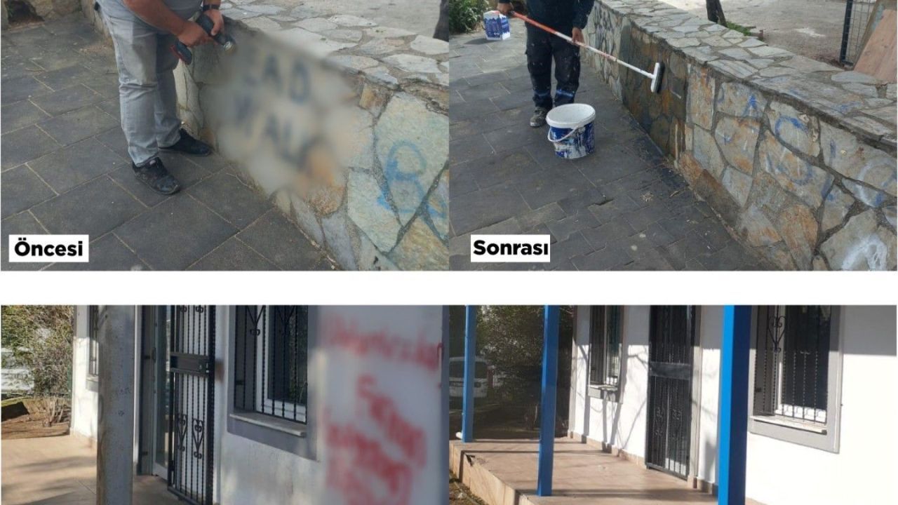 Bodrum Belediyesi Destek Hizmetleri Müdürlüğü, ortak yaşam alanlarının daha temiz ve daha düzenli olması için çalışmalarını aralıksız sürdürüyor. Destek Hizmetleri Müdürlüğü'ne bağlı Boya Badana Birimi tarafından kent genelinde çevre düzeni ve estetik görünümün korunması amacıyla çalışmalar gerçekleştiriliyor. İlçe genelindeki park, duvar, kamu binaları gibi alanlara yapılan resimler, yazılar, karalamalar ve boyamalar belediye ekipleri tarafından temizleniyor. Yeniden boyanarak düzenli bir görünüme kavuşturulan alanlar kent estetiğine uygun hale getiriliyor. Çalışmalar kapsamında son 6 ay içerisinde 29 duvar yazısı silindi. Belediye ekipleri, daha düzenli, temiz ve sürdürülebilir kent yaşamı için çalışmalarına devam edecek.