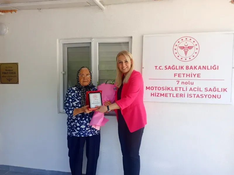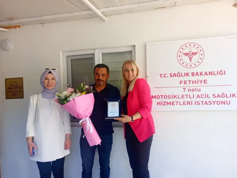 Muğla İl Sağlık Müdürü Dr. Eriş Başaran Akça, Fethiye’de hizmete açılan 7 No’lu Motosikletli Acil Sağlık Hizmetleri İstasyonu’nu ziyaret ederek, katkılarından dolayı hayırsever vatandaşlar Nurten Özer ve Metin Keskin’e teşekkür plaketi takdim etti.