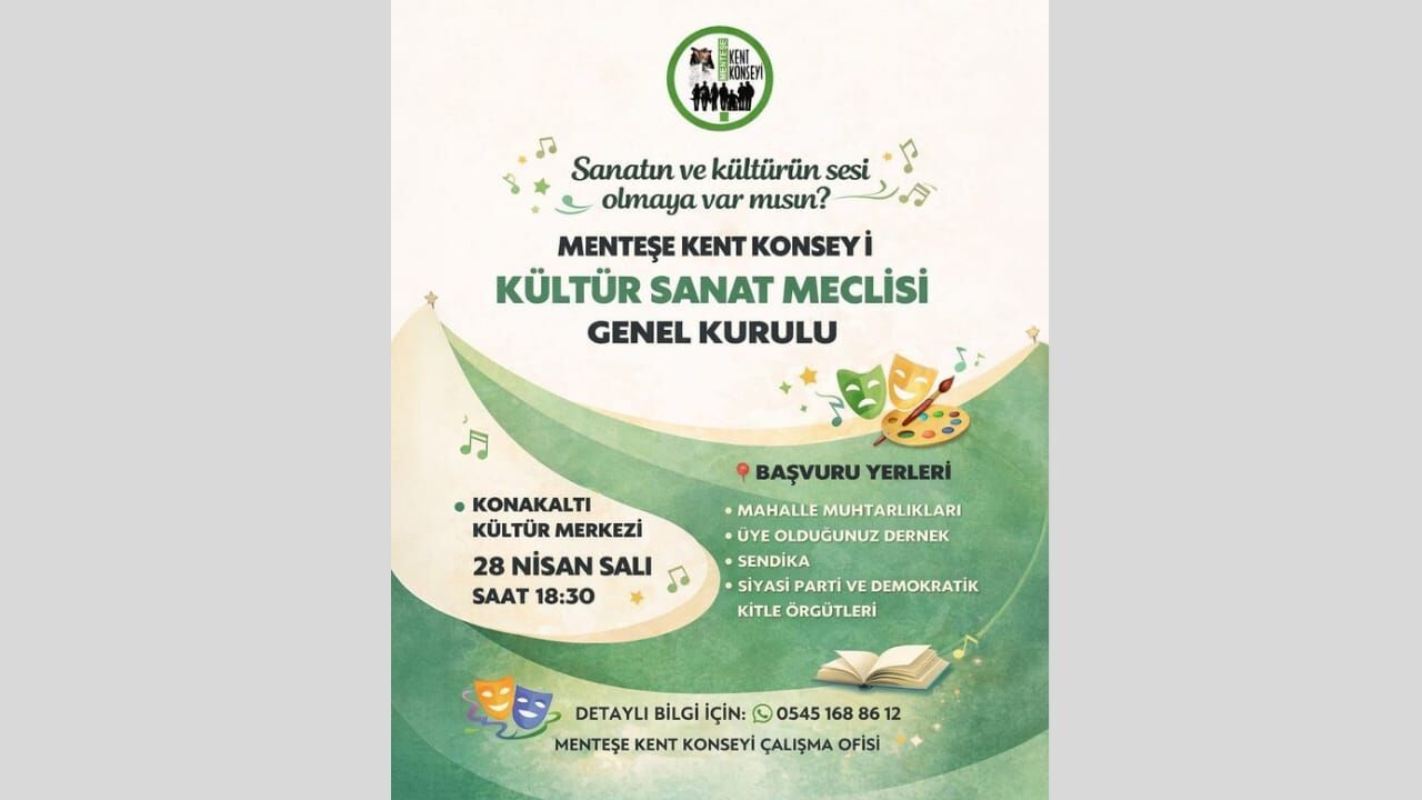 Menteşe Kent Konseyi öncülüğünde kurulacak olan Kültür Sanat Meclisi’nin genel kurulu, 28 Nisan Salı günü saat 18.30’da Konakaltı Kültür Merkezi’nde gerçekleştirilecek. Sanatçılar, akademisyenler, sivil toplum kuruluşları ve kültür-sanat alanında faaliyet gösteren tüm paydaşların katılımının beklendiği genel kurulda, meclisin yapılanması ve yol haritası belirlenecek.