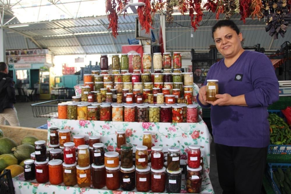 Muğla’nın Menteşe ilçesinde yaşayan 48 yaşındaki Ebru Yaraş, kendi elleriyle yaptığı onlarca çeşit reçelle pazaryerinin en renkli tezgahlarından birini oluşturuyor. "Mevsimi gelen her meyveden reçel yaparım" diyen Yaraş, hem emeğiyle hem de farklı tatlarla dikkat çekiyor. Menteşe Kapalı Pazaryeri’ndeki tezgahında satış yapan Ebru Yaraş, 20-25 çeşit reçelin her zaman tezgahında olduğunu söyledi. Patlıcan, incir, karpuz kabuğu, acı biber gibi alışılmışın dışında tatlar büyük ilgi görüyor. Ebru Yaraş, küçük kavanozları 200 TL, büyük kavanozları ise 350 TL’den satıyor. Tamamı ev yapımı olan reçellerini katkı maddesi kullanmadan hazırladığını belirten Yaraş, "Benim reçellerim, sadece tatlı değil; mevsimin özünü taşıyor" dedi.