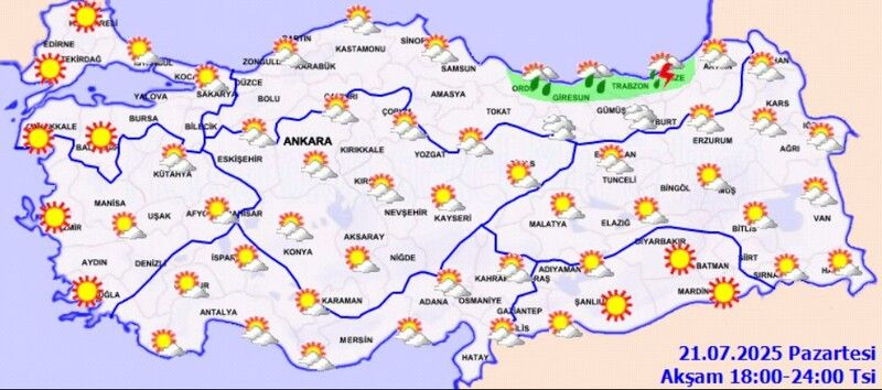 Meteoroloji Genel Müdürlüğü’nün 21 Temmuz 2025 tarihli değerlendirmelerine göre, Türkiye genelinde sıcak hava etkisini sürdürmeye devam ediyor. Kuzey ve iç kesimlerde parçalı bulutlu bir gökyüzü hâkim olurken, Orta ve Doğu Akdeniz’in Toroslar bölgesi, Doğu Karadeniz, Doğu Anadolu’nun kuzeyi ve Ordu çevresinde yerel sağanak ve gök gürültülü sağanak yağış bekleniyor. Diğer bölgelerde ise az bulutlu ve açık bir hava öngörülüyor.