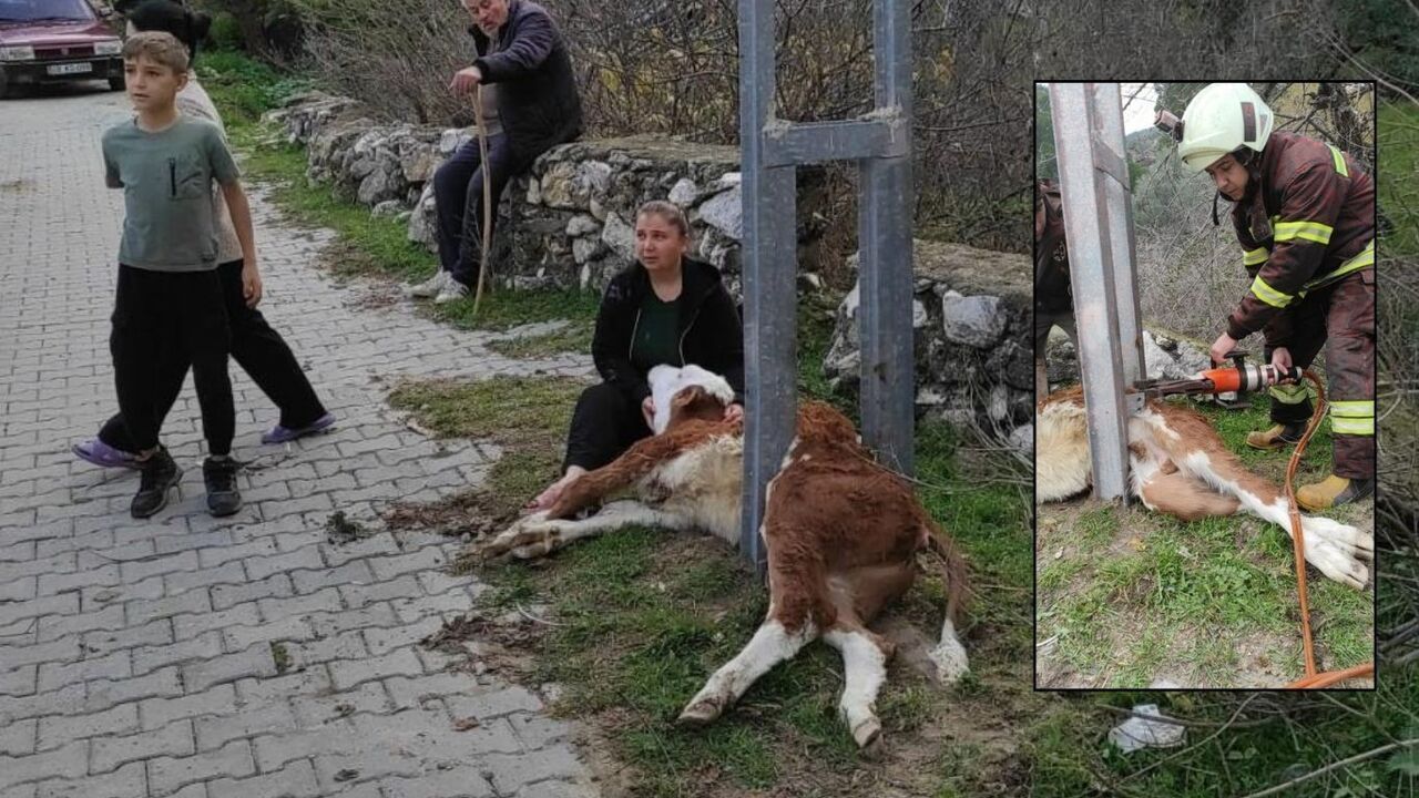 Muğla’nın Milas ilçesine bağlı İkiztaş Mahallesi’nde bir buzağı, aydınlatma direğinin metal bölümleri arasına sıkışarak mahsur kaldı. Hayvanın kendi başına kurtulamadığını fark eden çevre sakinleri durumu 112 Acil Çağrı Merkezi’ne bildirerek yardım istedi.