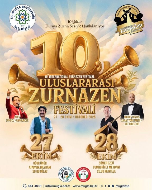 29 Ekim Cumhuriyet Bayramı etkinlikleri kapsamında Dünya’da ve Türkiye’de ilk olan Uluslararası Zurnazen Festivali’nin onuncusu bu yıl Milas’ta izleyicisi ile buluşacak. 27 Ekim Pazartesi Milas Atapark Meydanı, 28 Ekim Salı gününde Menteşe ilçesi Cumhuriyet Meydanı 10.Uluslararası Zurnazen Festivali’ne ev sahipliği yapacak. Dünya’nın farklı ülkelerinden gelen sanatçılar bayram coşkusuna renk katacak.