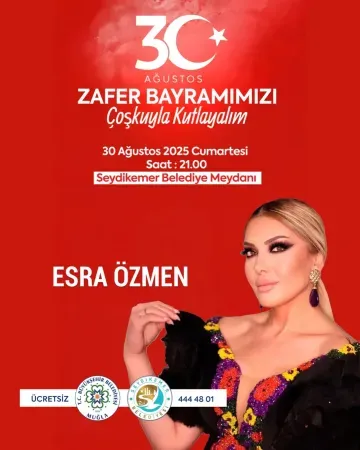Seydikemer Belediye Meydanı’nda Esra Özmen sahne alacak. 30 Ağustos coşkusunu doyasıya yaşatacak olan konser halka açık ve ücretsiz olacak.