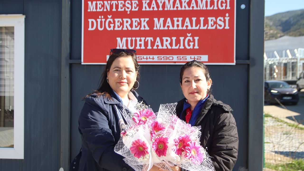 Muğla’nın Menteşe ilçesine bağlı Düğerek Mahallesi’nde tarihte ilk kez seçilen kadın muhtar Gülfer Etyemez, 8 Mart Dünya Kadınlar Günü dolayısıyla mahalledeki kadınlara çiçek dağıttı.