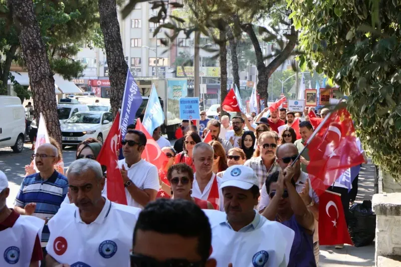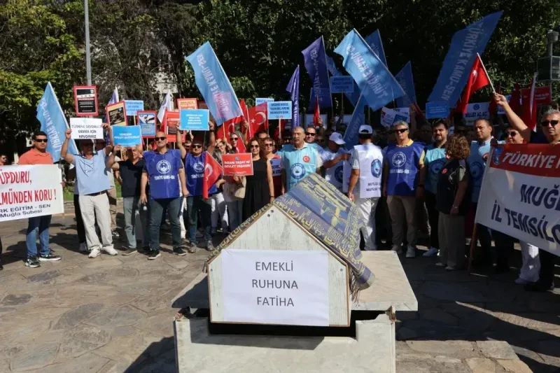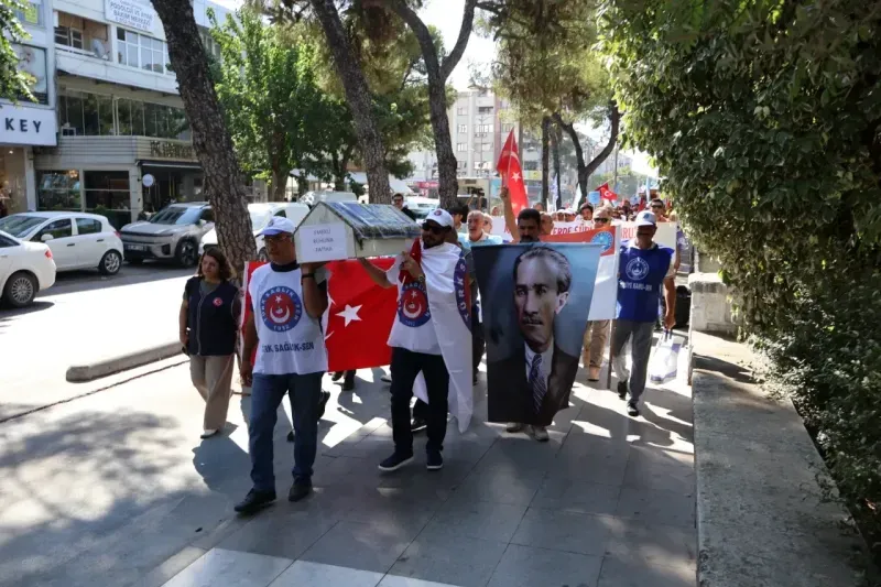 Muğla’nın Menteşe ilçesindeki Sınırsızlık Meydanı’nda bir araya gelen sendika üyeleri, “Emekli ruhuna fatiha” yazılı tabut taşıyarak çeşitli kamu kuruluşlarına yürüdü. Eylem, Menteşe Devlet Hastanesi önünde yapılan basın açıklamasıyla sona erdi.