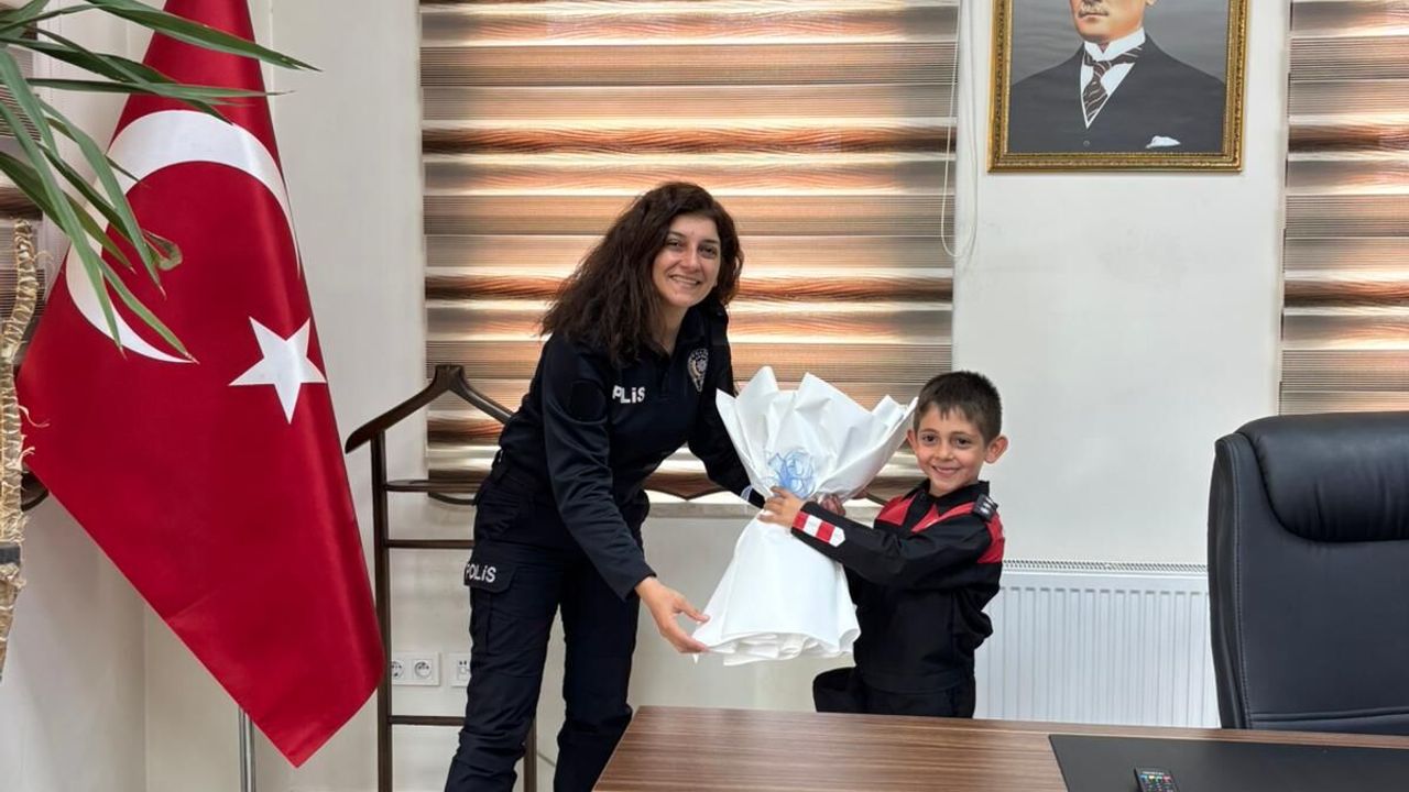Hayali gerçek olan Arın Taş’ın mutluluğu gözlerinden okunurken, emniyet mensupları küçük polis adayıyla yakından ilgilenerek çeşitli hediyeler takdim etti
