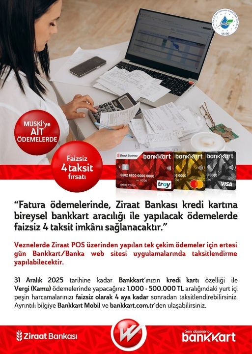 Ziraat Bankası ve MUSKİ arasında yapılan anlaşmaya göre kampanya, 31 Aralık 2025 tarihine kadar geçerli olacak. Kampanya kapsamında Bankkart’ın kredi kartı özelliği ile Vergi (Kamu) ödemelerinde 1.000 TL – 500.000 TL arasındaki yurt içi peşin harcamalar, faizsiz olarak 4 aya kadar sonradan taksitlendirilebilecek.