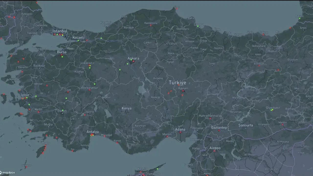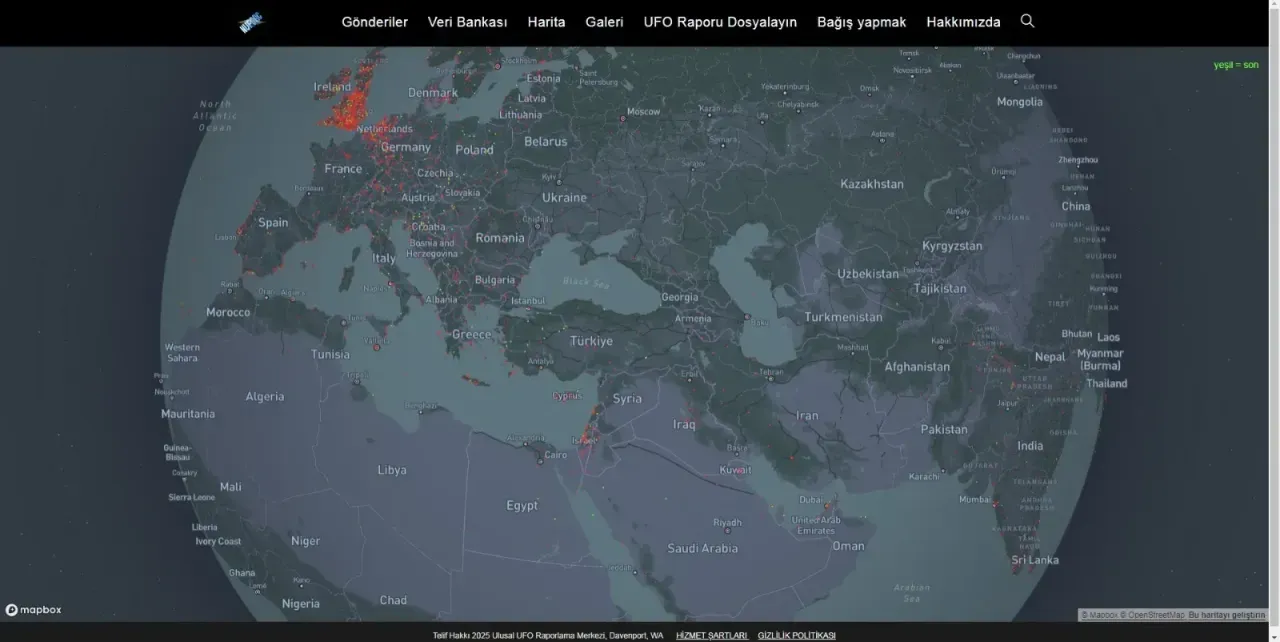 ABD merkezli NUFORC (National UFO Reporting Center), vatandaşlardan gelen UFO gözlem raporlarını interaktif bir harita üzerinde yayımlıyor. Haritaya bakıldığında Türkiye’nin birçok noktasında işaretler dikkat çekiyor. Renkli noktalar, geçmişten bugüne kadar bildirilen UFO gözlemlerini temsil ediyor. Özellikle kıyı şehirleri ve kalabalık bölgeler öne çıkıyor.