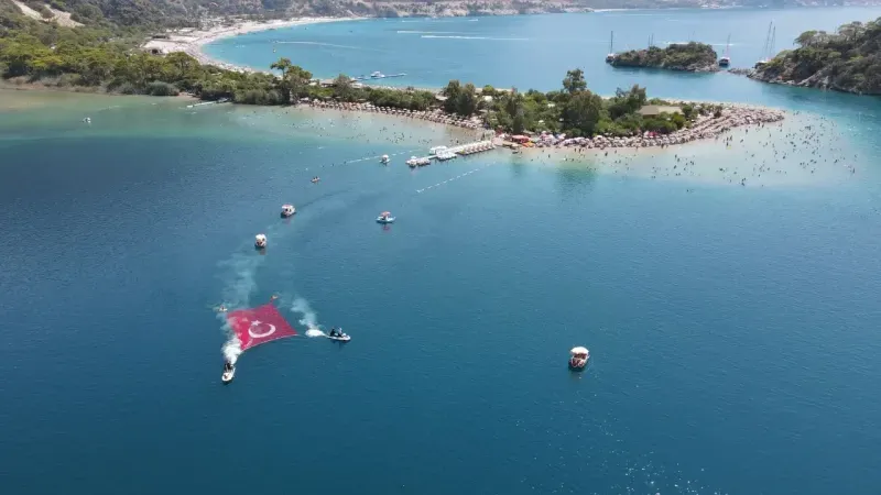 Beach Of Lagoon da su sporları araçlarıyla meşaleler yakılıp JAK timi tarafından kayalıklara dev Türk Bayrağı asılırken, büyük coşku yaşandı. Sahildeki yüzlerce tatilci ile denize girenler de bu anı aynı coşku içinde alkışladı.