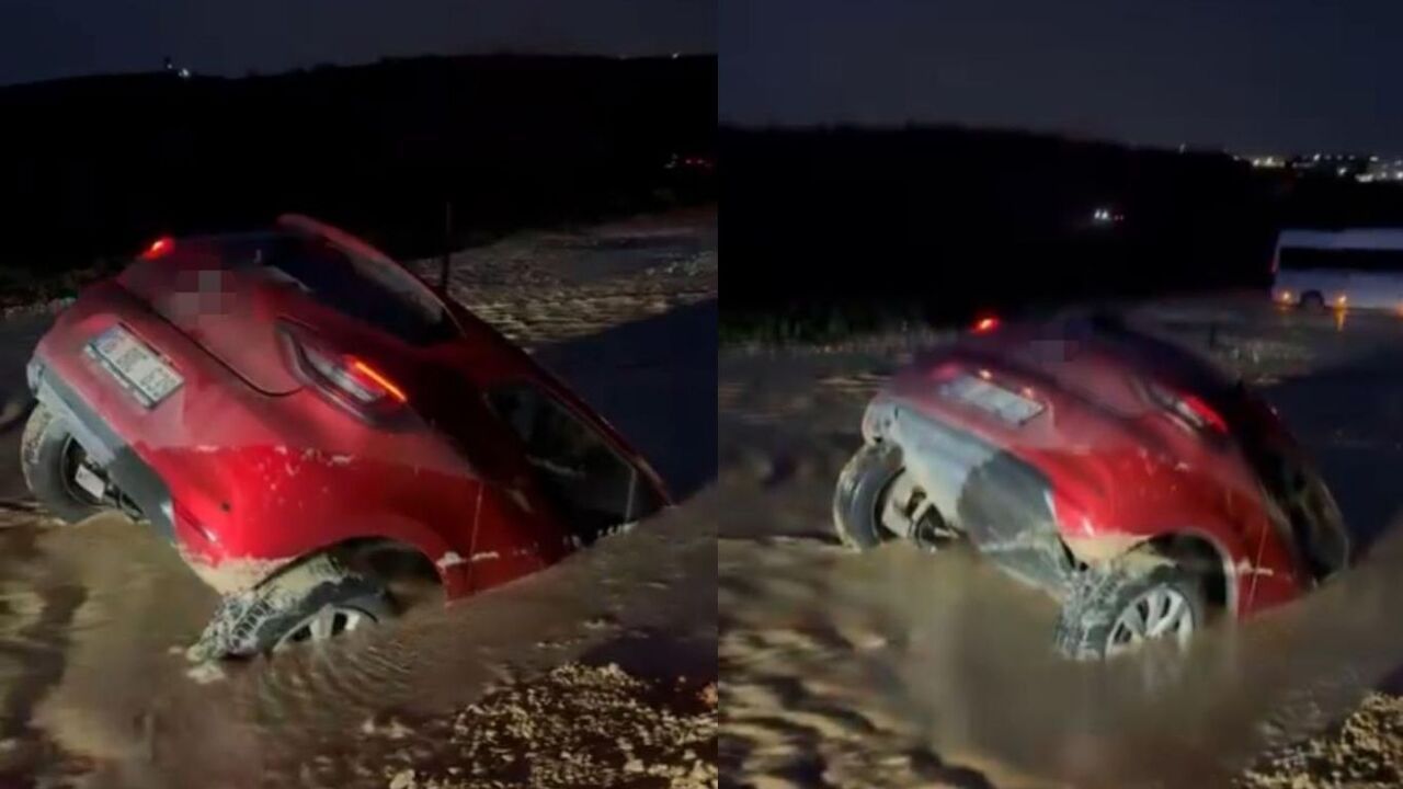 Bursa'nın Nilüfer ilçesinde yol çalışması nedeniyle oluşan çamura giren otomobil bataklığa saplandı. Araç yarıya kadar çamura gömülürken, sürücü otomobilden son anda çıkarak kurtuldu.