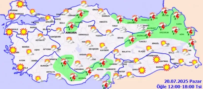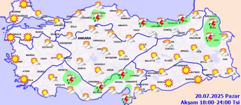 Meteoroloji Genel Müdürlüğü’nün son değerlendirmelerine göre, Türkiye'nin iç ve doğu kesimlerinde hava parçalı ve yer yer çok bulutlu olacak. Özellikle Akdeniz’in Toroslar kesimi ile İskenderun Körfezi çevresi, Doğu Karadeniz, Doğu Anadolu'nun kuzeyi, Kastamonu, Ordu, Konya ile Ankara'nın kuzey ve Çankırı’nın batı kesimlerinde yerel sağanak ve gök gürültülü sağanak yağışlar bekleniyor.