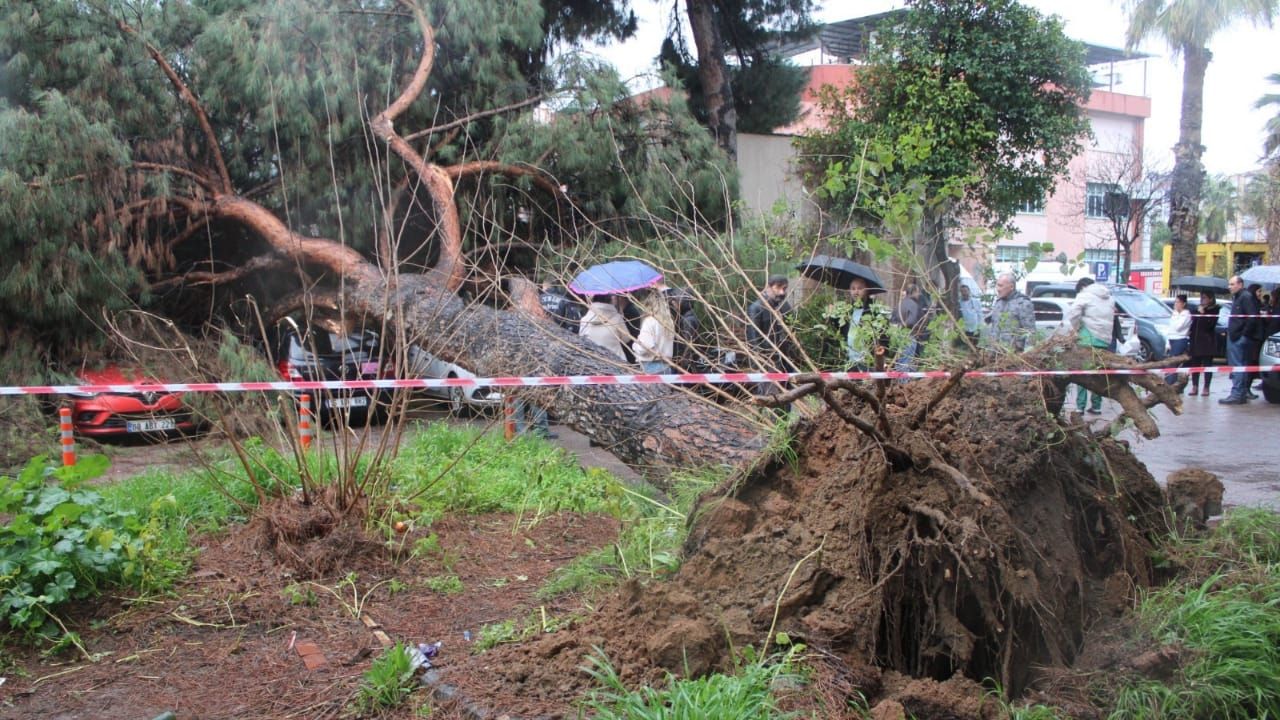 Aydın'ın Efeler ilçesinde hastane bahçesindeki dev çam ağacı, park halindeki araçların üzerine devrildi.
