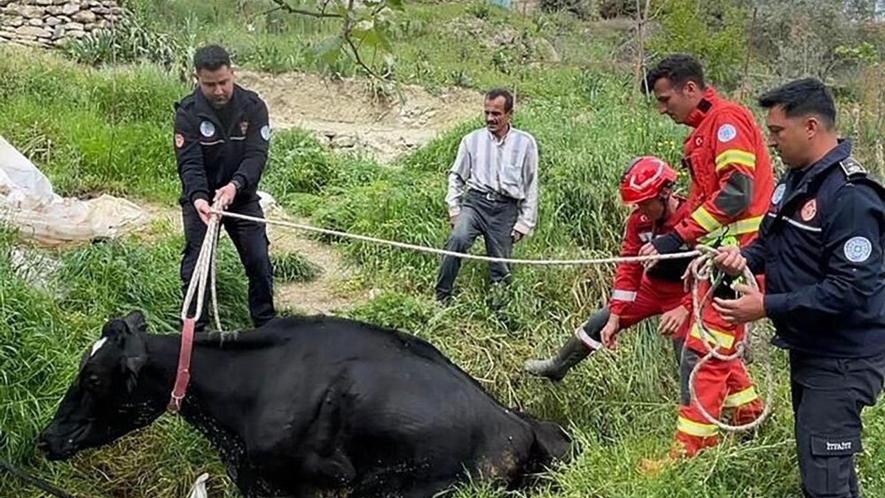 İhbar üzerine bölgeye Muğla Büyükşehir Belediyesi Seydikemer İtfaiye ekipleri sevk edildi. Kısa sürede olay yerine ulaşan ekipler, dikkatli bir çalışma yürüterek ineği bulunduğu yerden çıkardı. Yapılan müdahale sonrası hayvan güvenli alana alındı.