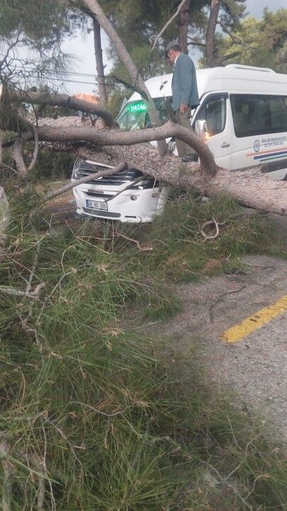 Muğla’nın Yatağan ilçesinde meydana gelen ilginç kazada, seyir halindeki bir dolmuşun üzerine çam ağacı devrildi.