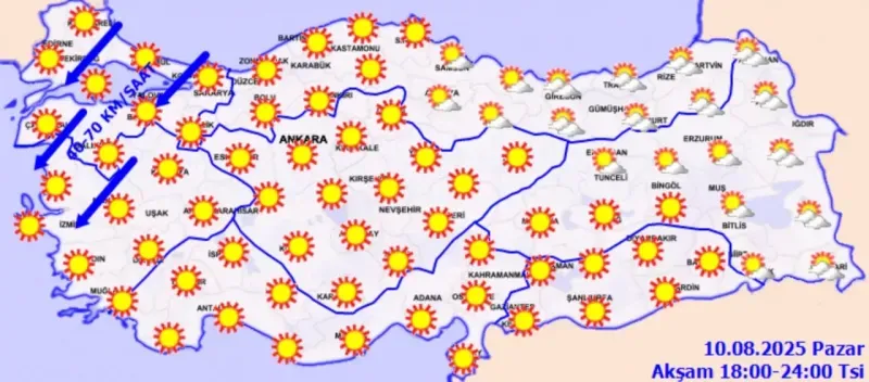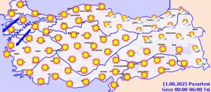 Marmara: Az bulutlu ve açık. Rüzgâr kuzey ve kuzeydoğudan kuvvetli ve fırtına şeklinde. İstanbul 31°C, Edirne 36°C, Kırklareli 33°C, Balıkesir 35°C.
