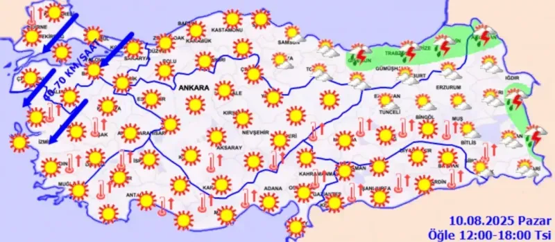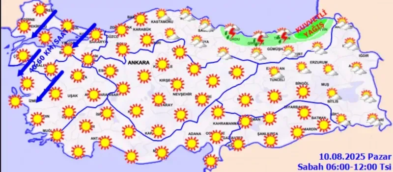 Orta ve Doğu Karadeniz: Parçalı yer yer çok bulutlu. Artvin 26°C, Trabzon 28°C, Samsun 30°C, Amasya 33°C.