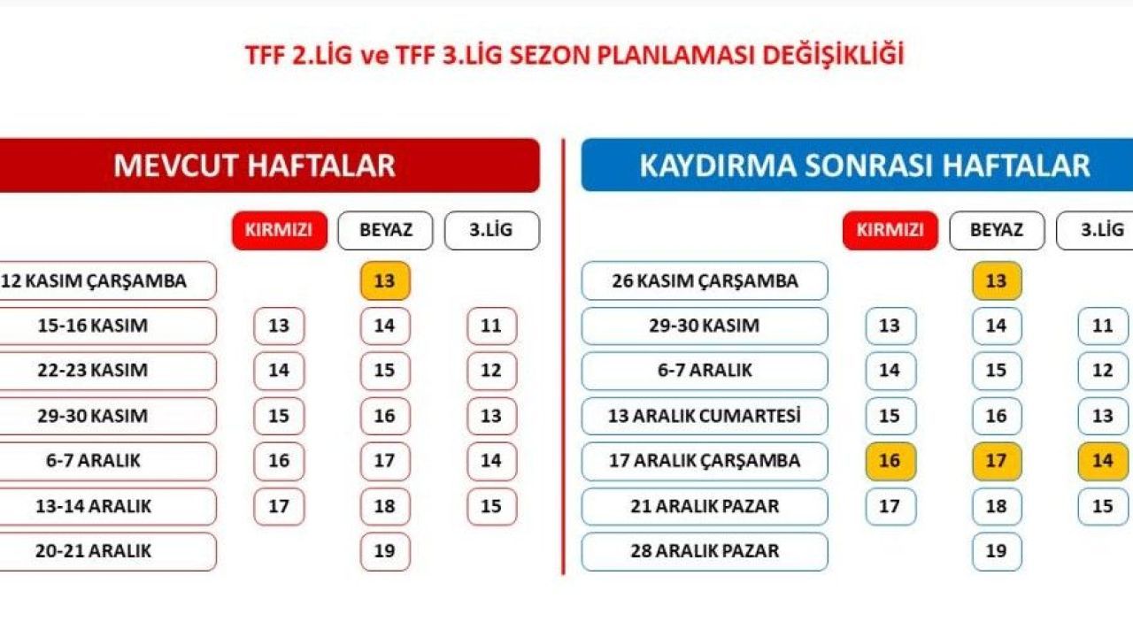 "Türkiye Futbol Federasyonu Yönetim Kurulu'nun TFF 2. Lig ve TFF 3. Lig'in iki hafta kaydırılması kararı doğrultusunda, ilk devrenin sonuna kadar oynanacak olan haftalar için belirlenen müsabaka takvimi değişti. Değişen tarihlere göre düzenlenmiş yeni müsabaka programları daha sonra ilan edilecektir. Trendyol Süper Lig ve Trendyol 1. Lig müsabakaları ise daha önce planlandığı şekilde oynanacaktır" denildi.