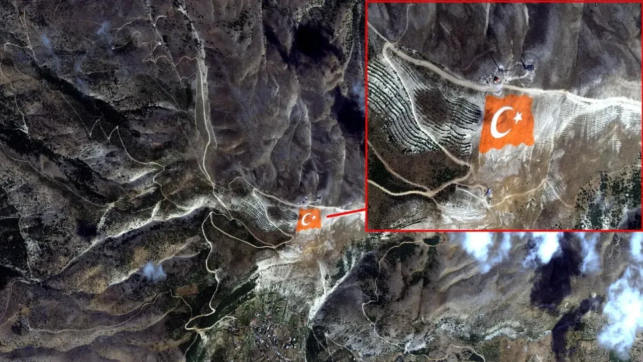 Kahramanmaraş'ın simgelerinden biri haline gelen Ahır Dağı zirvesine işlenen dev Ay Yıldızlı Türk Bayrağı, Cumhuriyet Bayramı dolayısıyla Göktürk-1 uydusu tarafından uzaydan görüntülendi.