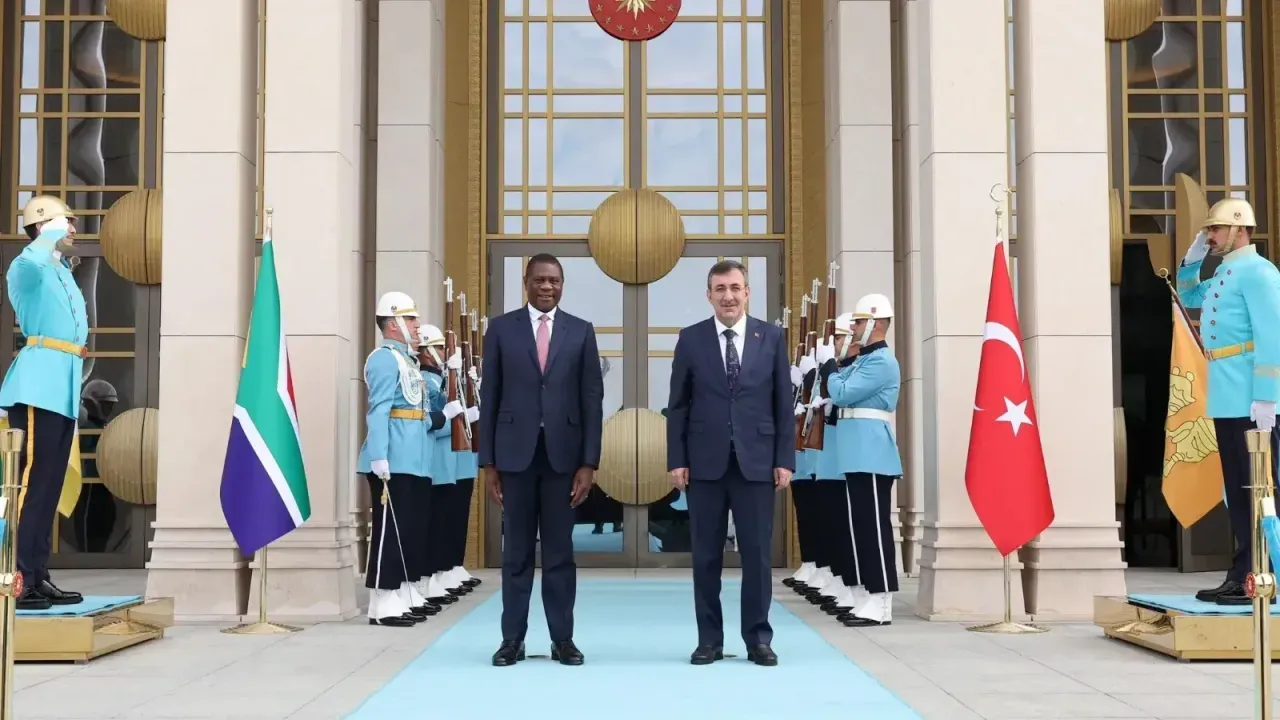 Cumhurbaşkanı Yardımcısı Yılmaz ile Güney Afrika Cumhurbaşkanı Yardımcısı Paul Mashatile, Türkiye Cumhuriyeti-Güney Afrika Cumhuriyeti Arasındaki İkili Ulusal Komisyon (İUK) Mekanizması Toplantısı çerçevesinde Cumhurbaşkanlığı Külliyesi'nde bir araya geldi. Baş başa gerçekleştirilen görüşme ve Türkiye Cumhuriyeti-Güney Afrika Cumhuriyeti Arasındaki İkili Ulusal Komisyon (İUK) Mekanizması Toplantısı'nın ardından yapılan anlaşmaların ve mutabakat muhtıralarının imza töreni gerçekleştirildi. Törenin ardından ikili ortak basın açıklaması yaptı.