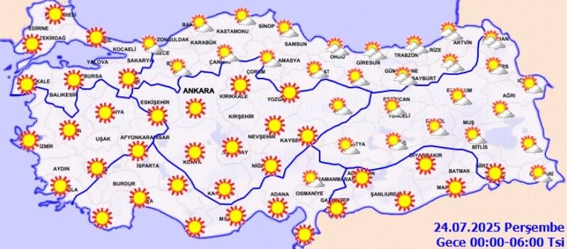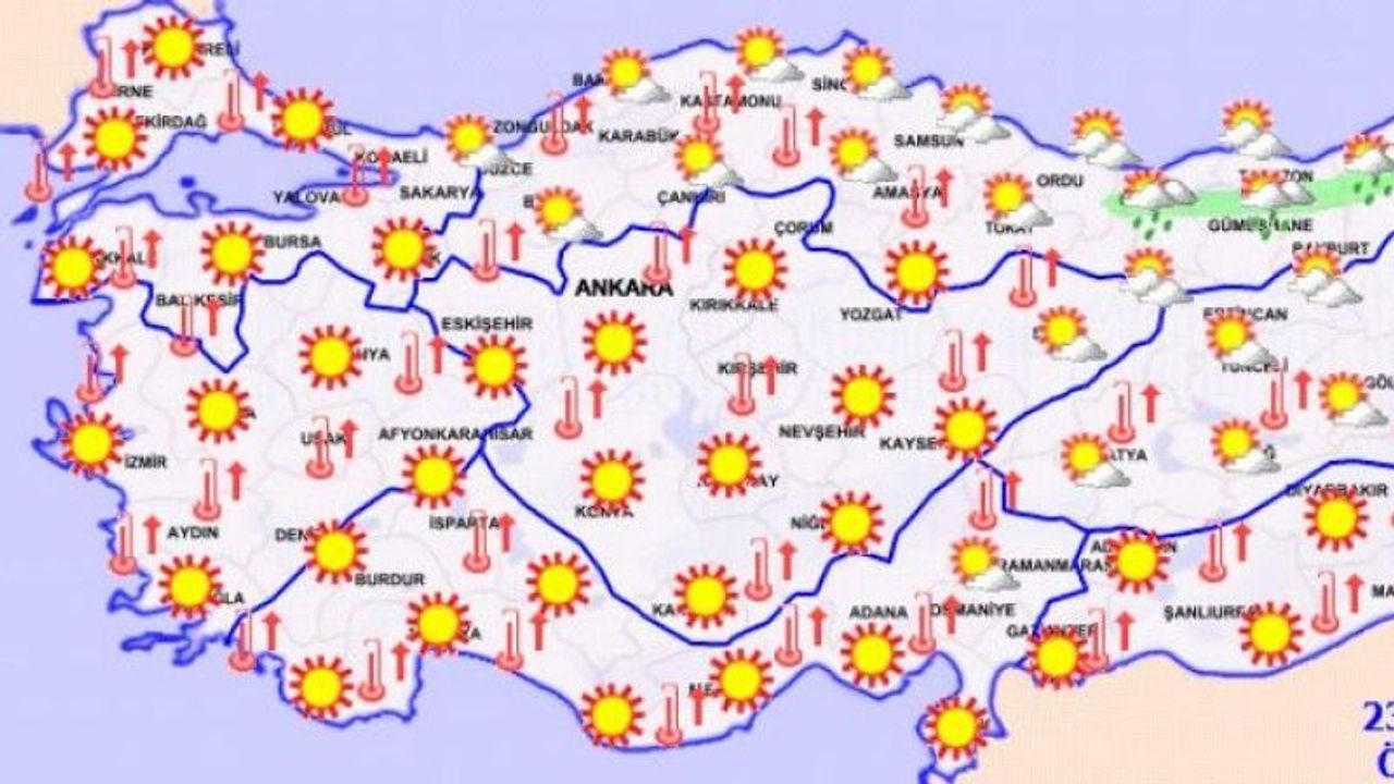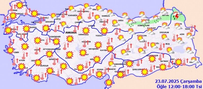 Meteoroloji Genel Müdürlüğü’nün 23 Temmuz 2025 tarihli son tahminlerine göre, Türkiye genelinde hava sıcaklıkları mevsim normallerinin üzerinde seyretmeye devam edecek. Ülkenin kuzeydoğu kesimleri dışında kalan bölgelerde hava açık ve az bulutlu olacak. Ardahan çevreleri, Giresun, Trabzon, Rize ve Artvin’in iç ve yüksek kesimleri ile Kars’ın kuzey ilçelerinde ise öğle saatlerinden sonra yerel sağanak ve gök gürültülü sağanak yağışlar bekleniyor. Meteorolojik bir uyarı ise bulunmuyor.