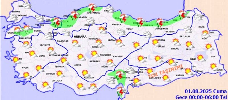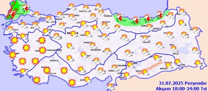 Meteoroloji Genel Müdürlüğü verilerine göre ülkemizin kuzey, iç ve doğu kesimlerinde parçalı ve yer yer çok bulutlu hava hakim olacak. Trakya, Batı Karadeniz, Orta ve Doğu Karadeniz kıyıları ile Kocaeli, İstanbul, Sakarya, Yalova, Bursa, Balıkesir’in kuzeyi, Çanakkale’nin doğusu, Kütahya, Adana’nın kuzey ve doğusu, Kahramanmaraş’ın batısı, Hatay kıyıları, Artvin, Kars ve Ardahan çevrelerinde yerel sağanak ve gök gürültülü sağanak yağış bekleniyor. Akşam saatlerinde özellikle Tekirdağ’ın batı kesimleri ile Edirne’de yağışların kuvvetli olacağı tahmin ediliyor. Güneydoğu Anadolu’da ise toz taşınımı görüleceği öngörülüyor.