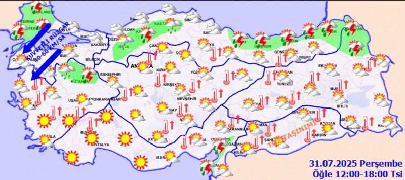 Trakya, İstanbul, Kocaeli, Sakarya, Bursa, Yalova, Çanakkale’nin doğusu ve Balıkesir’in kuzey kesimlerinde yerel sağanak ve gök gürültülü sağanak yağış bekleniyor. Bölge genelinde rüzgar kuzey ve kuzeydoğu yönlerden kuvvetli esecek. İstanbul 30°C, Edirne 34°C, Balıkesir 34°C, Kırklareli 31°C olacak.