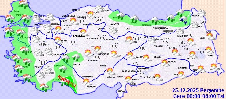 24 Aralık Çarşamba günü Türkiye genelinde yağış, sis ve pus etkili olacak. Meteoroloji Genel Müdürlüğü’nün son tahminlerine göre özellikle Marmara’nın batısı, Ege, Batı ve Orta Karadeniz ile Antalya’nın doğusunda yağış beklenirken; iç ve doğu bölgelerde sis, pus ve yer yer karla karışık yağmur görülecek. Vatandaşların sel, ulaşım aksamaları ve görüş mesafesi düşüşlerine karşı dikkatli olması istendi.
