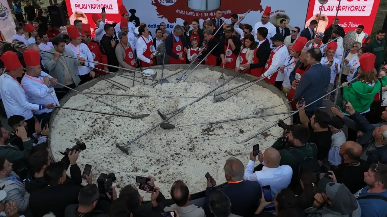 Kültür ve Turizm Bakanlığının Edirne'de düzenlediği "Yaşayan Miras Festivali" çerçevesinde, 6 ton pirinç pilavı pişirildi. Türkiye'nin pirinç üretiminin yaklaşık yüzde 60'ının yetiştirildiği Edirne'de hasat edilen 6 ton pirinç, Türkiye'nin en büyük tenceresinde pişirildi. Dev tencerede pişirilen pilav, vatandaşlara ikram edildi. Vatandaşlar pilav alabilmek için uzun kuyruklar oluşturdu.