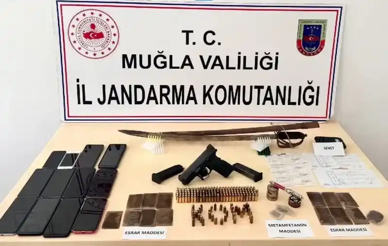 Şüphelilerin evlerinde, işyerlerinde ve araçlarında yapılan aramalarda XT9 marka tabanca, 3 adet şarjör, değişik ebatlarda 184 adet tabanca fişeği, samuray kılıcı, 14 parça halinde 156 gram plaka esrar 1 gram metamfetamin, 3 adet kullanma aparatı, 2 adet uyuşturucu öğütme aparatı, çok sayıda senet, satış sözleşmesi ve tapu evrakları, 23 adet cep telefonu, 5 adet hard disk veri depolama cihazı ve 9 adet bilgisayar ele geçirildi.
