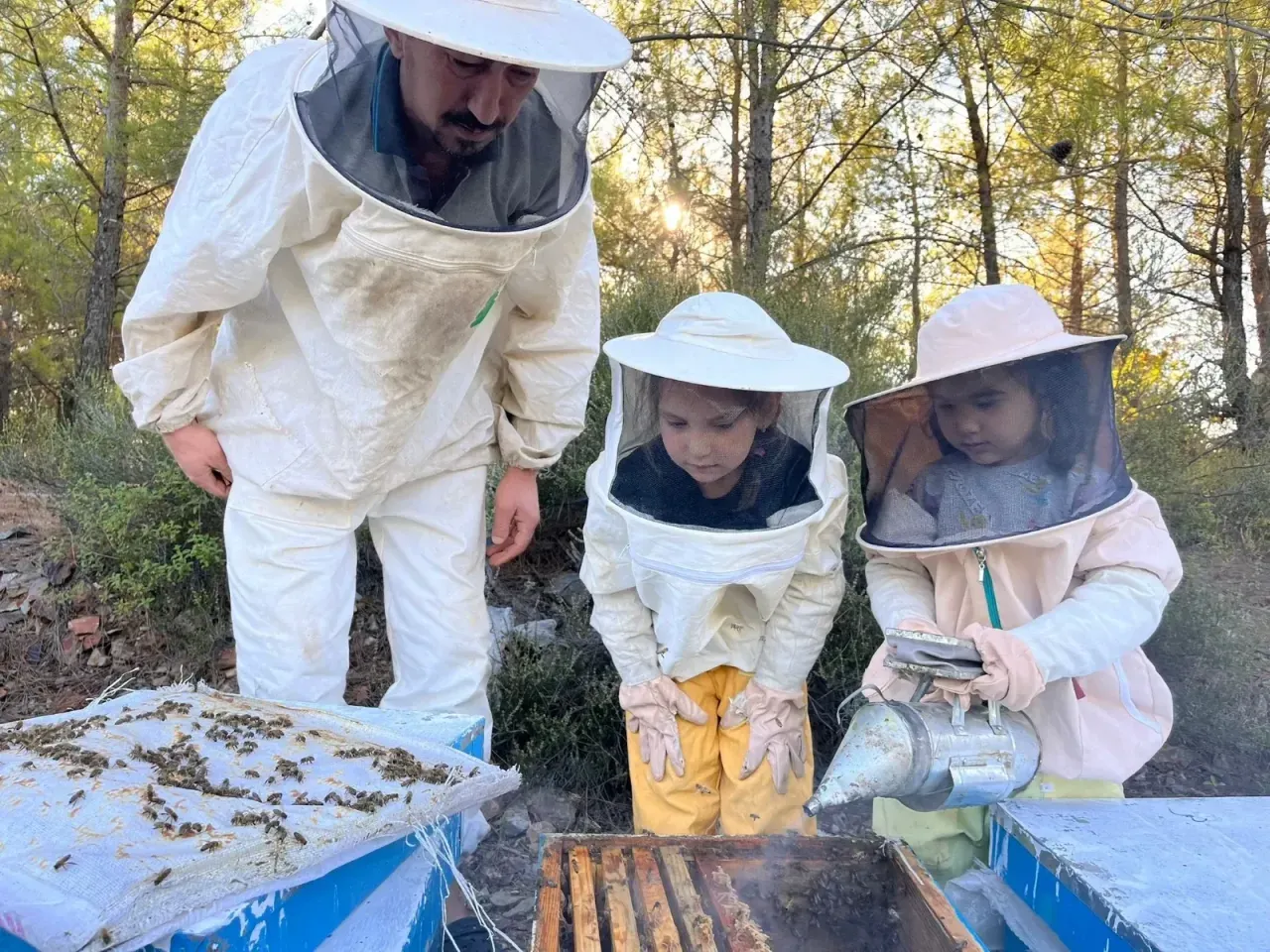 Muğla’nın Yatağan ilçesinde arıcılıkla uğraşan Servet Çıldır’ın 6 ve 3 yaşındaki kızları küçük yaşlarına rağmen babalarına arıcılık işlerinde yardım ederek örnek oluyor.